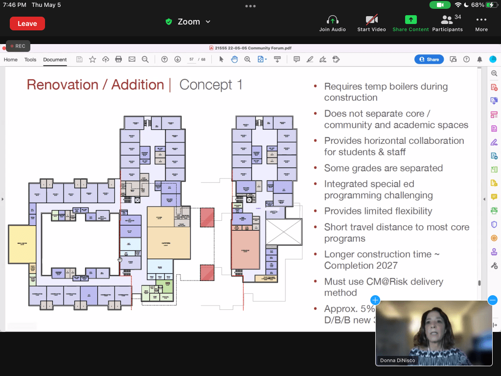 At a virtual Community Forum held last night, hosted by the Elementary School Building Committee (ESBC), Donna DiNisco of DiNisco Design led the audience through major aspects of the work undertaken so far to generate a specific proposal for a new elementary school combining the Wildwood and Fort River schools.