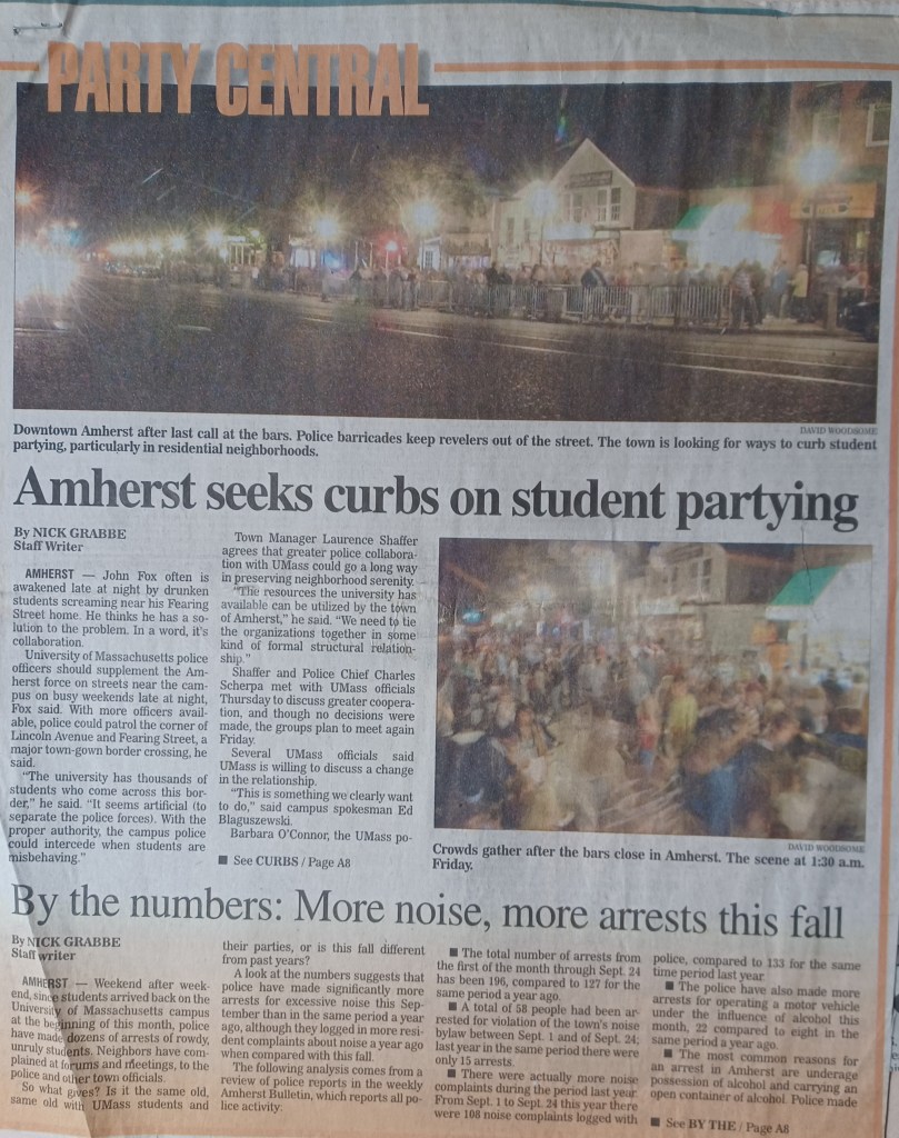 In 1997, a UMass student, apparently drunk, died after he fell through a greenhouse roof on campus. The police were responding regularly to gatherings of hundreds of students, many of them drunk, outside Antonio’s and on Hobart Lane. Longtime residents living near the campus complained about late-night noise. The Gazette frequently reported incidents of student misbehavior – and some in Amherst wondered if it exaggerated the extent of the problem. In 1998, the Gazette produced a special section called “One Weekend in Amherst” about student drinking.